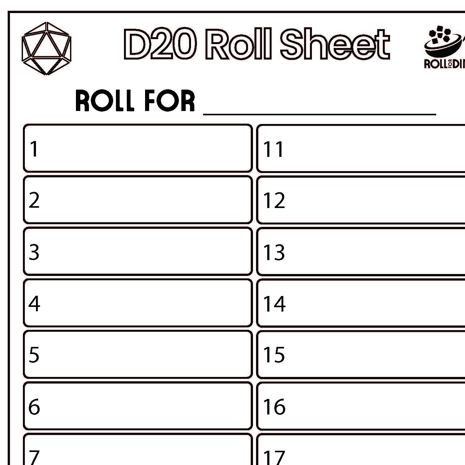 These are our basic roll sheets, print them out and roll for anything. One for each standard die D4, D6, D8, D10, D12, D20